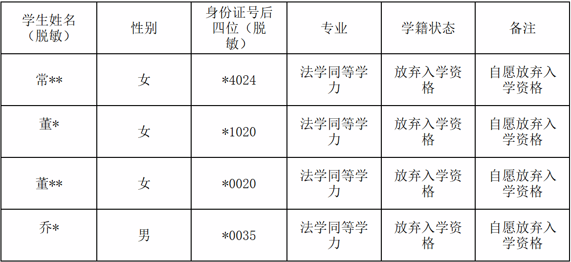 根据规定,按国家招生规定录取的研究生新生,凭研究生录取通知书及有关证件,在规定日期内到校办理入学手续。因故不能按期办理手续者,须事先请假并附有关证明,经学校批准,可延期报到,期限不得超过2周。未请假或者请假逾期的,除因不可抗力等正当事由以外,视为放弃入学资格。经过多次复查和审核,并向未及时办理入学手续的相关研究生履行通知和放弃入学资格的确认程序,法学院(知识产权学院)审定,现拟取消2025级4名同等学力研究生新生入学资格,并报河南科技大学研究生院对4名新生作放弃入学资格处理。名单详见附件。